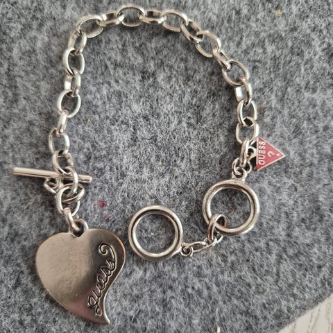 Guessin pinkki nahkainen ranneke, jossa roikkuu hopean värinen nalle. Nallen toisesta silmästä puuttuu kivi. Käyttämätön.