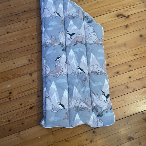 puuvillaa (50 %) ja polyesteriä (50 %), täyte muovipulloista valmistettua kierrätyspolyesterivanua (100 %), kankaan ja vanun välissä non-woven-kangas