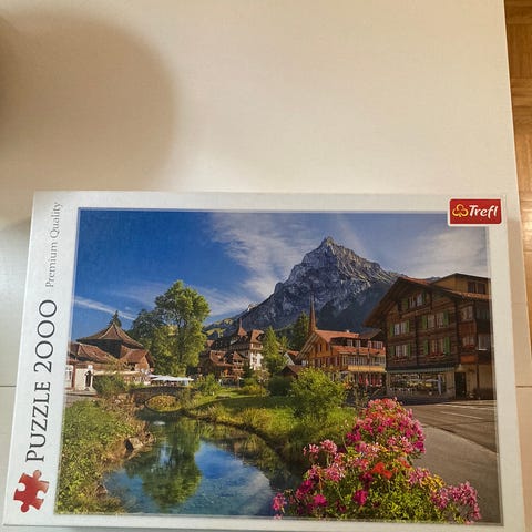 Uutena ostettu ja kerran kasattu palapeli. "Malenda Trickin taidekuva, jossa on viinilaseja, juustoa, viinirypäleitä ja hedelmiä."