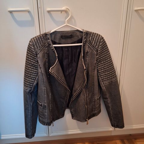 Takki on valmistettu keinonahasta ja siinä on vetoketjutaskut sekä kaulus.