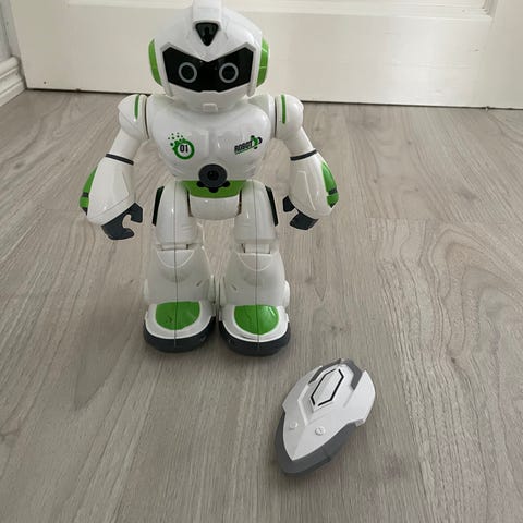 Kertoo vitsejä ja tarinoita, kysyy arvoituksia, tanssii, kävelee, ampuu vaahtokiekkoja, musiikkia. Suomenkielinen. Kaukosäädin. Toimii pattereilla. Ostettu pari vuotta sitten, mutta lapsenlapsi käyttänyt hyvin vähän. Vain nouto.