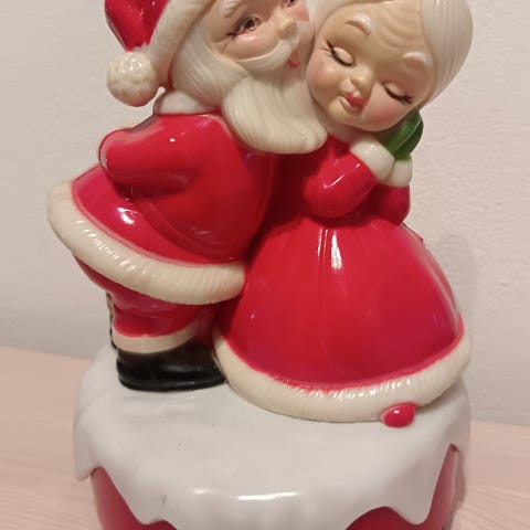 Vintage soittorasia. Joulupukki ja muori aiheinen soittorasia. Toimiva ja hyväkuntoinen, säilössä ollut. Musiikki Jingle Bells. Muovinen, kitsch. Made on Hong Kong. Korkeus noin 18 cm, pyörivä.