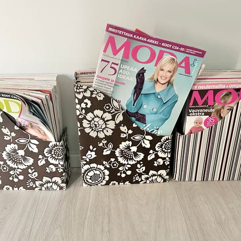Paketissa kolme tavallista Moda lehteä kaava-arkkeineen sekä yksi Moda kesäkoti lehti.