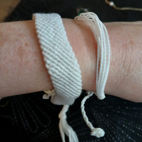 Rannekoru, jossa on valkoisia helmiä ja mustavalkoinen silmäkoru keskellä. Säädettävä musta nyörikiinnitys, sopii erilaisiin ranteen kokoihin.
