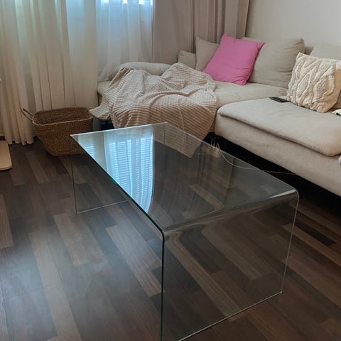 Kolme kerroksinen muotoilu. Materiaali karkaistu lasi ja metallirunko. Kokonaismitat: 90 x 45 x 43 cm. Väri musta.
