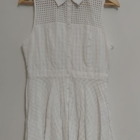 Hyväkuntoinen mekko M/L kokoiselle. Kokolapussa XL, mutta pientä mitoitusta. Kainalo-kainalo 52 cm ja pituus 97 cm. Kangas ei jousta, mutta vyötärönauha joustaa. Valkoinen ja mustia sydämiä. Kaksi kangaskerrosta ja napit edessä.