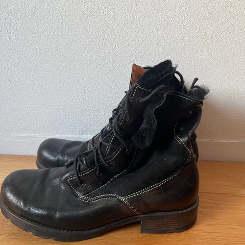 Lämpimät lammasnahkaiset saappaat, turkista koko sisäpuoli. Korkeus pohjan reunasta 16cm, kengän pituus 28 cm, leveys päkiän kohdalla 10,5 cm (ulkomittoja). Pohjassa reiluja uurteita.