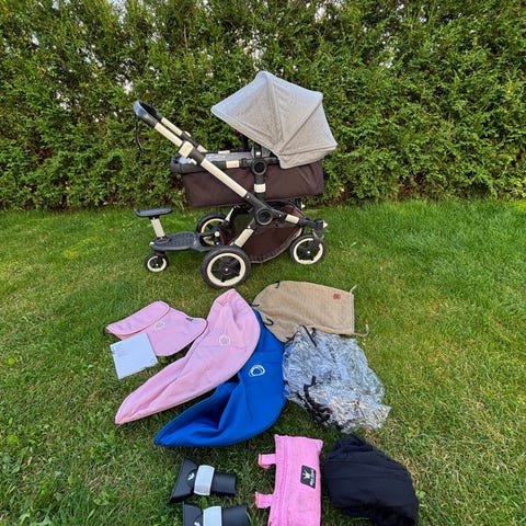 Mukaan iso sekä pieni hoitolaukku, sadesuoja, uusi alakori, muki/pulloteline. Turvakaareen nahkainen suoja, uusi.