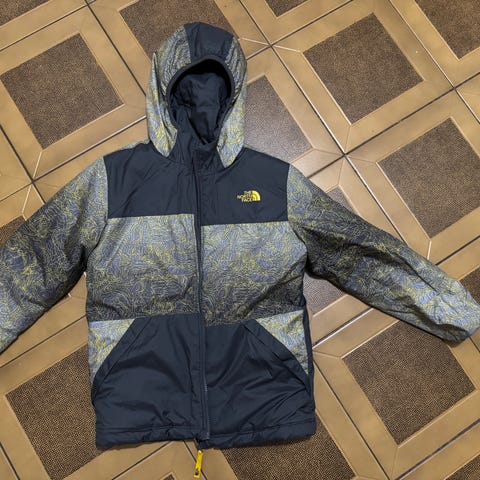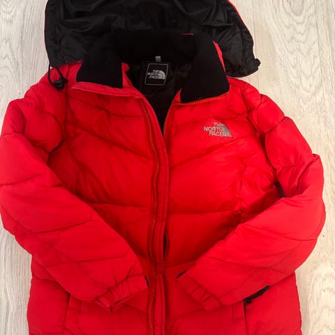 The North Face Lasten Takki. Takissa on huppu, vyö ja vetoketjukiinnitys. Sisäpuoli on kullansävyinen. Kulkeutuu Oulun keskustaan omien aikataulujen mukaan.