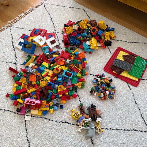 Duplo palikat settinä. Setissä mm. karuselli, maatila, numerojuna ja ensimmäinen traktori Karusellia ja maailmanpyörää voi pyörittää