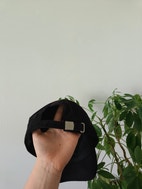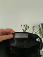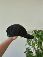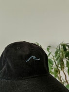 Musta vakosamettinen lippis / lippalakki. Eteen kirjailtu sinisellä langalla aalto. Lippiksen kokoa voi säätää takaa.