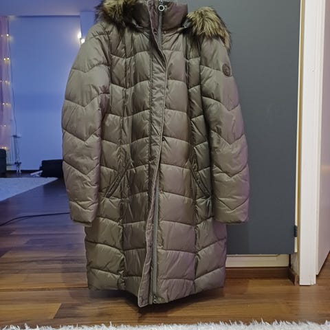 Todella laadukas, viime talvena hinta 175 EUR ja edelleen myydään sillä hinnalla. Toisen taskun pohjassa sisäpuolella purkauma, siitä hinnan alennus. Kokolapussa 38, mutta itse 40-kokoisena koen sopivaksi. Tarpeeksi pitkät hihat!