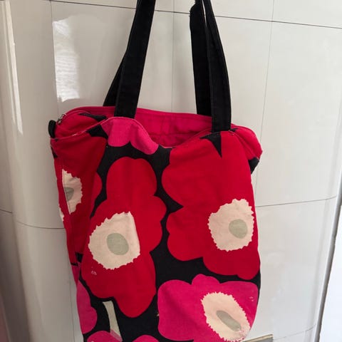 Marimekko käsilaukku, Funny Kioski Unikko, 38x40cm, pienet hihnat sekä hihnat 74cm, musta. Uusi ja käyttämätön.