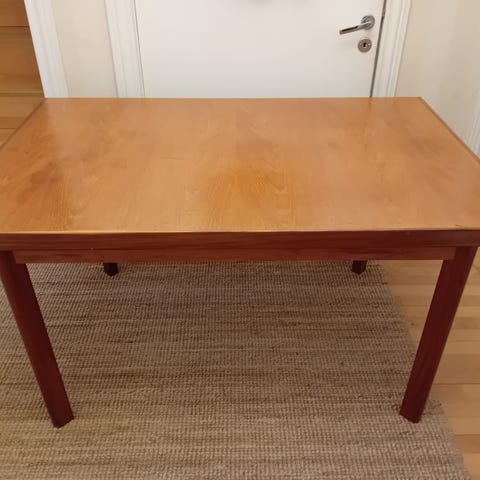 Hieno teak ruokapöytä. Pöydässä ja tarjoilutasossa pienet valkoiset jäljet. Tuolit menneet jo