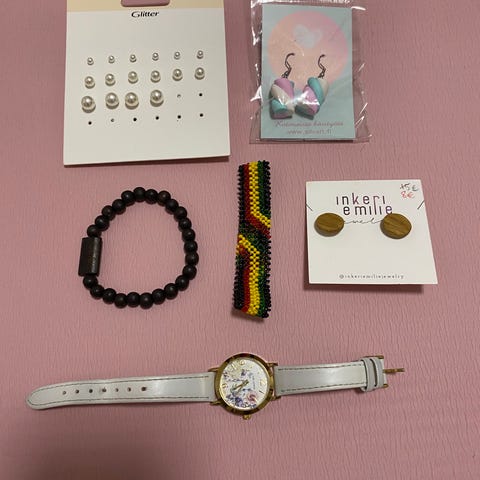 Kuvan korut: Kaksi kaulakorua, korvakorut, perhosrintakoru ja enkelipinssi.