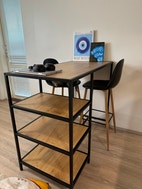 Myydään tyylikäs korkea ruokapöytä kahdella tuolilla. Musta metallirunko ja puunsävyinen kansi, jotka sopivat hyvin moderniin sisustukseen.