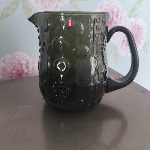 Upea kirkas Iittalan Frutta kaadin / kannu. Kannuun tuli harmillisesti halkeama (3. kuvassa piirretty linja) ja täytettäessä vesi vuotaa siitä vähitellen ulos. Vesikannuna tätä ei siis enää voi käyttää, mutta jos pidät tästä suomalaisen muotoilun taideteoksesta koriste-esineenä, tule hakemaan! Tämä olisi myös kuivakukille kaunis maljakko.