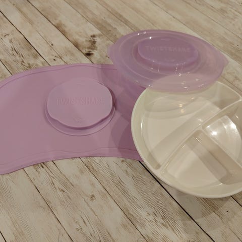 TwistShake alustoja 2kpl, syviä lautasia kansineen 3kpl, matalia lautasia 2kpl sekä matalia osiolautasia 2kpl. Mataliin lautasiin kansia 3kpl. Matalia lautasia eniten käytetty ja näissä käytön jälkiä on. Pesukoneessa pesty.