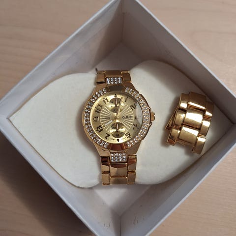 Kaunis, korunomainen rannekello. Kellossa ei toimivaa paristoa. Kvartsikoneisto, metallikehys ja ruostumaton terästausta.