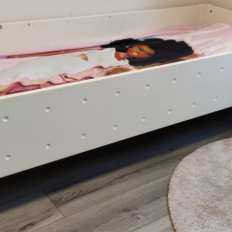 Lasten juniorisänky, talomallinen, valmistettu vaaleasta puusta. Sängyn runko on suunniteltu juniorikäyttöön ja siinä on kangasverhoilu, joka muodostaa talon muotoisen katon ja seinät. Ostettu itse tehtynä, tukeva rakenne. Patjan koko 70x160, ei tule mukana. Ei purettavissa osiin, ei kuljetusmahdollisuutta. Talosänky.