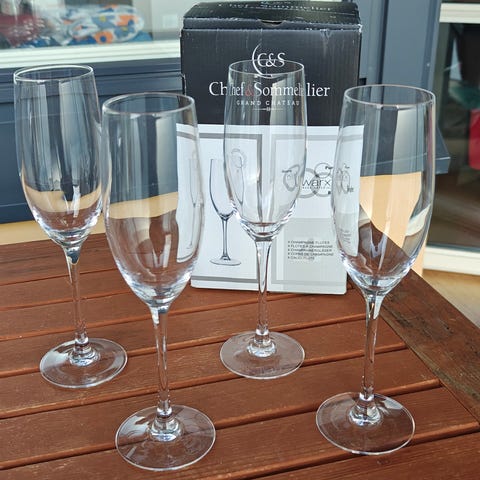 Kauniit, käsinpuhalletut shampanjamaljat alkuperäispakkauksessa.