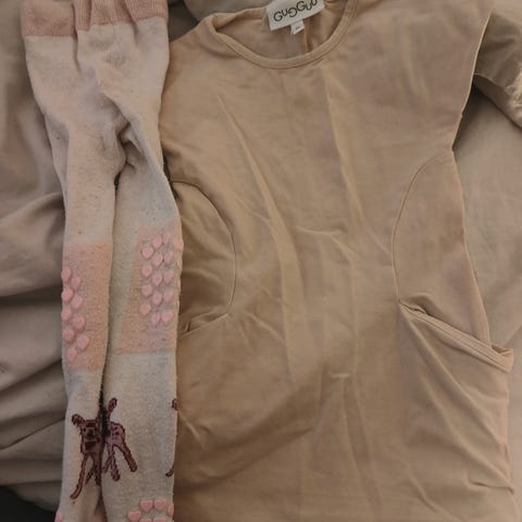Gugguun koon 80 mekko, jossa pieni melko huomaamaton tahra sekä Lindexin villaa sisältävät sukkahousut koossa 74/80.