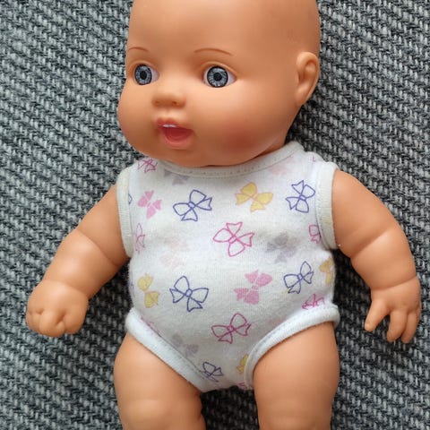 Hyvin pieni ja nätti vauvanukke. Vauva nukkuu matolla. Pituus n. 11 cm. Nouto tai postitus.