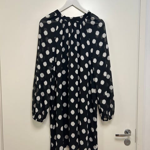 Ja Torin tekoälyn sanoin:) Holly & Whyte juhla- tai cocktailmekko, koko L. Mekko on mustavalkoinen, valmistettu kevyestä kankaasta ja siinä on pitkät hihat. Mekossa on koristelacey yksityiskohtia kaula-aukossa ja hihansuissa.