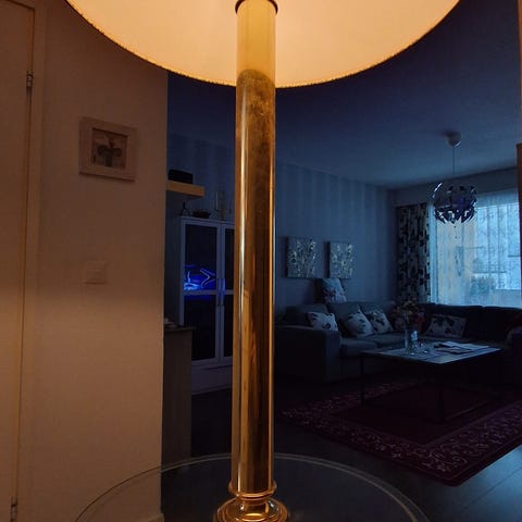 Muuten hyvässä kunnossa oleva lamppu, mutta puuttuu katkaisin ja virtajohto, kun puput päättivät jyrsiä johdon poikki. Korkeus 176cm. Vain nouto!