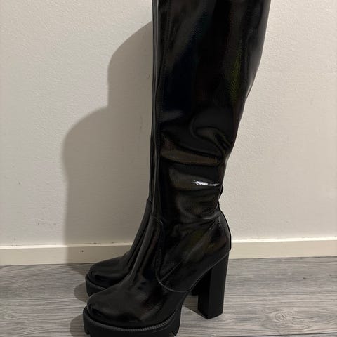 Uudet saapikkaat, korko 10cm. Vetoketju vain nilkassa, varsi taitettava. Jääneet käyttämättä