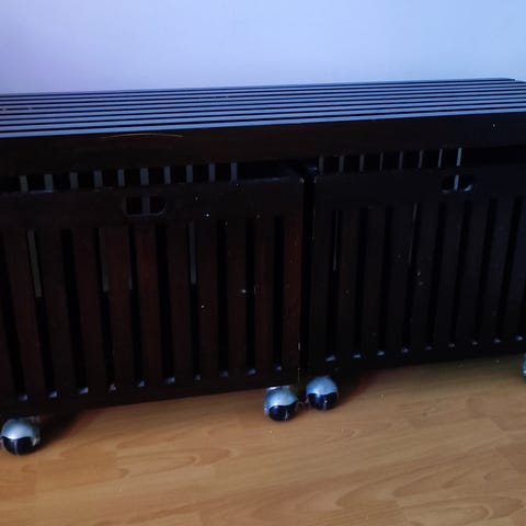 Kuvien mukainen taso 1 laatikolla, jossa renkaat. Tumna ruskea.
