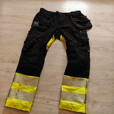 Remppahousut koossa 50. Läpinappi lähtenyt ja toisessa lahkeessa hivenen rispaantumaa.