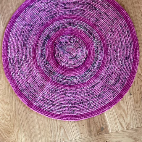 Myydään mummin virkkaama villamatto, halkaisija n.52cm. Tehty villasukkalangasta (7 veljestä tms.) kaksinkertaisella langalla, niin on paksumpi. Mukana hopeaista lankaa, joka kiiltelee hienosti paikoin. Tämän alle on hyvä laittaa liukueste niin pysyy paikoillaan :-)