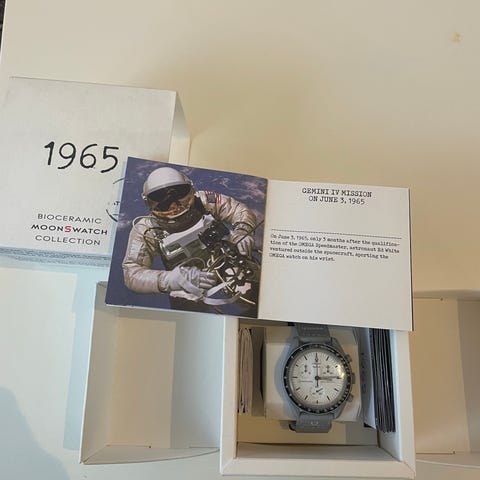 Myydään harvinainen MoonSwatch “Mission to the Moonphase Snoopy” – valkoinen, klassisen Speedmaster-henkinen kronografi kuun vaiheen näytöllä.