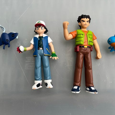 Pokémon Ash Ketchum hahmofiguuri, jossa sininen liivi, valkoinen t-paita, siniset housut ja punainen lippis. Materiaali muovia. Figuuri on ihmishahmo, joka esittää Pokémon-animaatiosarjan päähenkilöä.