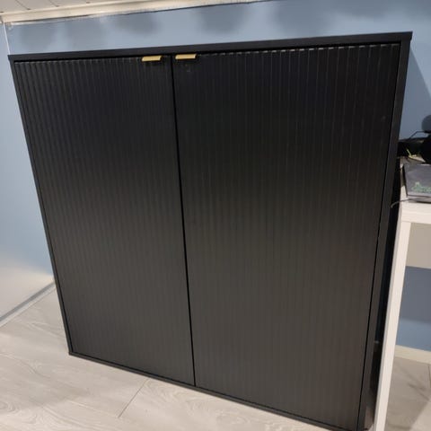 Myydään vaaleanharmaa kaappi jossa neljä lokeroa ovella.