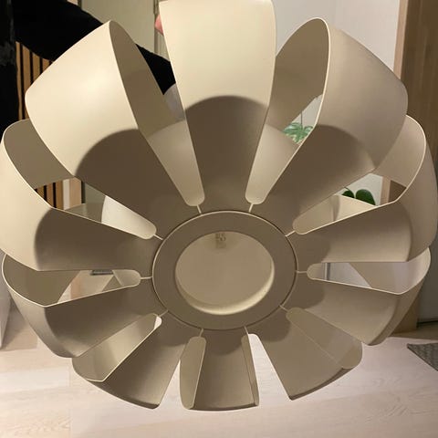 Myydään 80 -luvun aito design kattovalaisin. Valmistaja Sirrah ja suunnittelija Giovanni Offredi. Opaakkia pleksiä, beiget yksityiskohdat. Varjostimen halkaisija 60 cm.