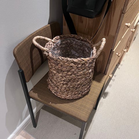 Jämäkkä kori / suojaruukku. Vähän multainen voi olla sisältä. Halkaisija sisältä 20cm korkeus 25cm