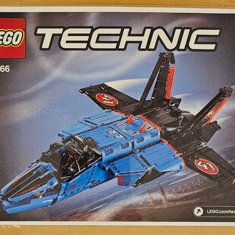 Tuotekuvauksen suomennos Lego sivulta: Saavuta yliääninopeuksia tällä valtavalla, aerodynaamisella LEGO® Technic -ilmakilpasuihkukoneella, jossa on sininen, musta ja punainen väritys, kilpuritarrat ja useita monimutkaisia teknisiä yksityiskohtia ja moottoroituja toimintoja, kuten säädettävä suutin pystysuoraan tai vaakasuoraan lentoonlähtöasentoon, luukku pyörivälle tuulettimelle, avattava runko, sisäänvedettävä laskuteline ja säädettävät läpät. Manuaalisiin toimintoihin kuuluvat toimiva etuohjaus, siirrettävät peräsimet ja avattava ohjaamo. Tämä kestävä ja erittäin yksityiskohtainen 2-in-1-malli on suunniteltu tarjoamaan mukaansatempaavan ja palkitsevan rakennus- ja leikkikokemuksen, ja siitä voi rakentaa yksityissuihkukoneen.