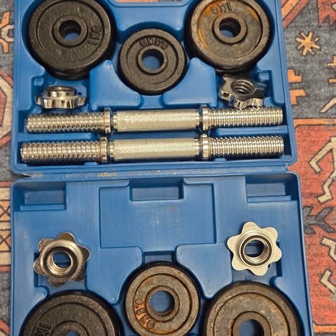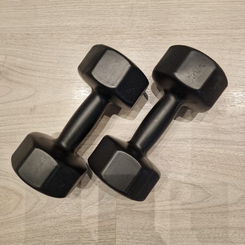 Myynnissä hyväkuntoisia käsipainoja kotikäyttöön. Saatavilla eri painoisia käsipainoja: 0,5 kg, 1,0 kg ja 5,0 kg. Sopivat erinomaisesti lihaskuntoharjoitteluun, kuntoutukseen tai kevyempään treeniin kotona. Painot ovat siistit ja ehjät, eikä niissä ole merkittäviä käytön jälkiä.