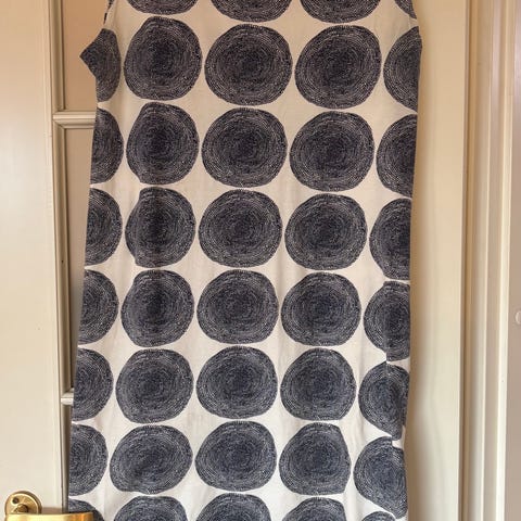 Marimekon sininen hihaton pitkä raitamekko, made in Finland. Koko M. Kai-kai 47, niska-helma 116. Siisti käytetty kunto, pinnassa hieman pesunukkaa, kuvissa mekkoa ei ole silitetty. Käytön jälkiä on, mutta ne ovat kovin huomaamattomia. Pari pientä tahraa helman paikkeilla ja pieni reikä helmassa takana (kuvat) Reikä on helppo korjata. Tahroja en ole yrittänyt poistaa, mekko on vain pesty normaalisti. Hinta 13 euroa plus postikulut. Nouto Tampereelta onnistuu myös.