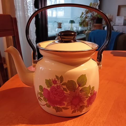 Finel Onnimanni, kukallinen kahvipannu, 1 litra, korkeus 12,5 cm, suunnitellut Kai Franck, kukka kuvion luonut Raija Uosikkinen, nouto tai postitus