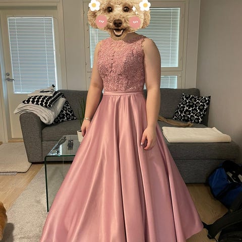Myynnissä kerran käytetty uutena ostettu vanhojentanssi/juhlamekko. Lyhennetty 160cm pituiselle. Mekon alla ollut vannehame(ei tule mekon mukana)