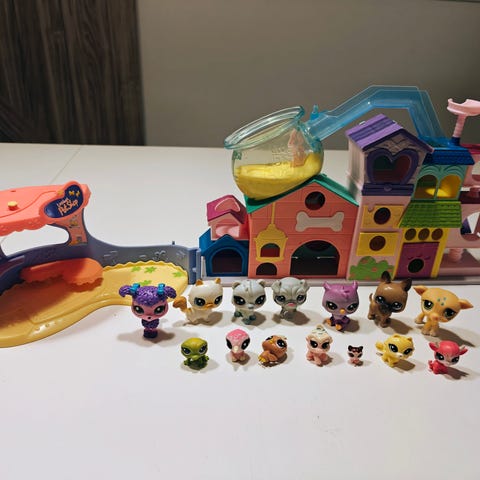 Myydään hyväkuntoinen, iso Littlest Pet Shop -leikkisetti, joka sisältää ison "talo"-osan ja erillisen lisäosan/rakennelman (kuten kuvassa). Mukana tulee 10 erilaista Littlest Pet Shop -hahmoa (petsejä), jotka ovat vanhempaa, keräilijöiden suosimaa sukupolvea. Setissä on mm. liukumäki, pyöriviä osia ja tasoja. Täydellinen setti LPS-leikkeihin tai keräilyyn. Myydään kokonaisuutena.