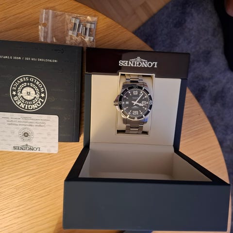 Myynnissä Longinesin Hydro Conquest automaattichrono. Malli: 36444566 Halkaisija: 41mm. Mukaan kaikki laatikot, paperit ja tukuulaput (vm. 2012) Toimitetaan alkuperäisellä teräsrannekkeella ja Longinesin omalla linkkurannekkeella. Märkäpukujatkeet molemmissa. Postitus Suomessa sisältyy hintaan. Hakemaankin saa tulla, tai kulkeutuu Valkeakoski - Tampere. Ei vaihtoja.