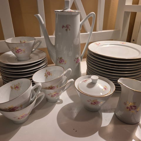 Vanhoja Upsala-ekeby astoita, 2 tarjoiluastiaa, 2 kannua,2 matalaa ja syvää lautasta ja 3 leipälautasta. Nouto. Tarjoa.
