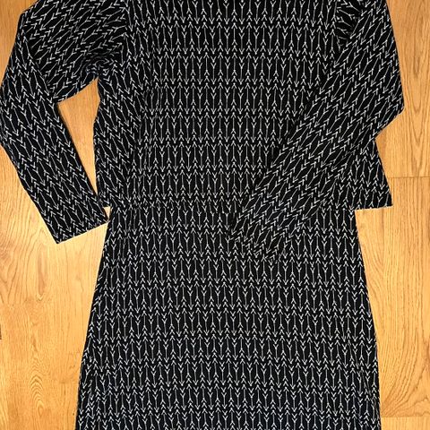Noukin bambukankainen mekko musta-valkoisella kuosilla. Kokomerkintä L, vastaa mielestäni M/L kokoa. Kangas on ihanan pehmeää ja joustavaa, pitää hyvin kuosinsa ja pysyy kauniina pesusta toiseen. Kietaisuyläosa (ei voi itse säätää), alaosassa kaksinkertainen kangas. Erittäin hyvässä kunnossa.