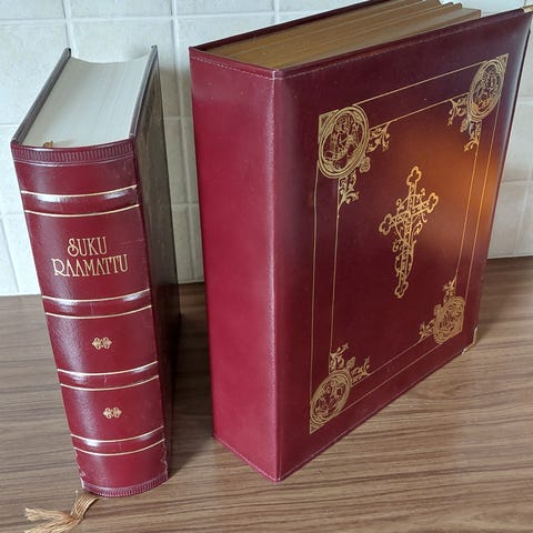Sukuraamattu, evankelis-luterilaisen kirkon virallinen suomennos vuodelta 1992. Sisältää graafisen suunnittelun ja kuvituksen. ISBN 951-35-5676-x. Koko 25x31 cm, paksuus 8 cm. Ei täytetty, tekstin joukossa muutama merkintä lyijykynällä. Nouto Lauttasaaresta. Postitus onnistuu postimaksuja vastaan.