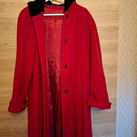 Punainen villakangastakki, kokonaan vuoritettu: 70% villa 20%polyamide ja 10% cashmere - Kauluksessa kiinteä kaulaliina, jonka voi myös klassisesti kiepauttaa pään ympärille huiviksi.