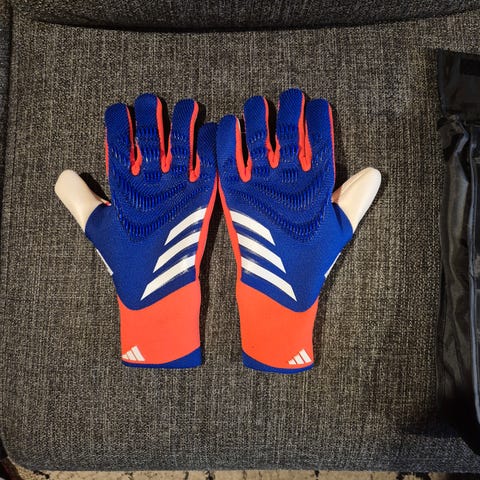 Adidas Predator jalkapallohanskat koko 9.5 sininen punainen valkoinen